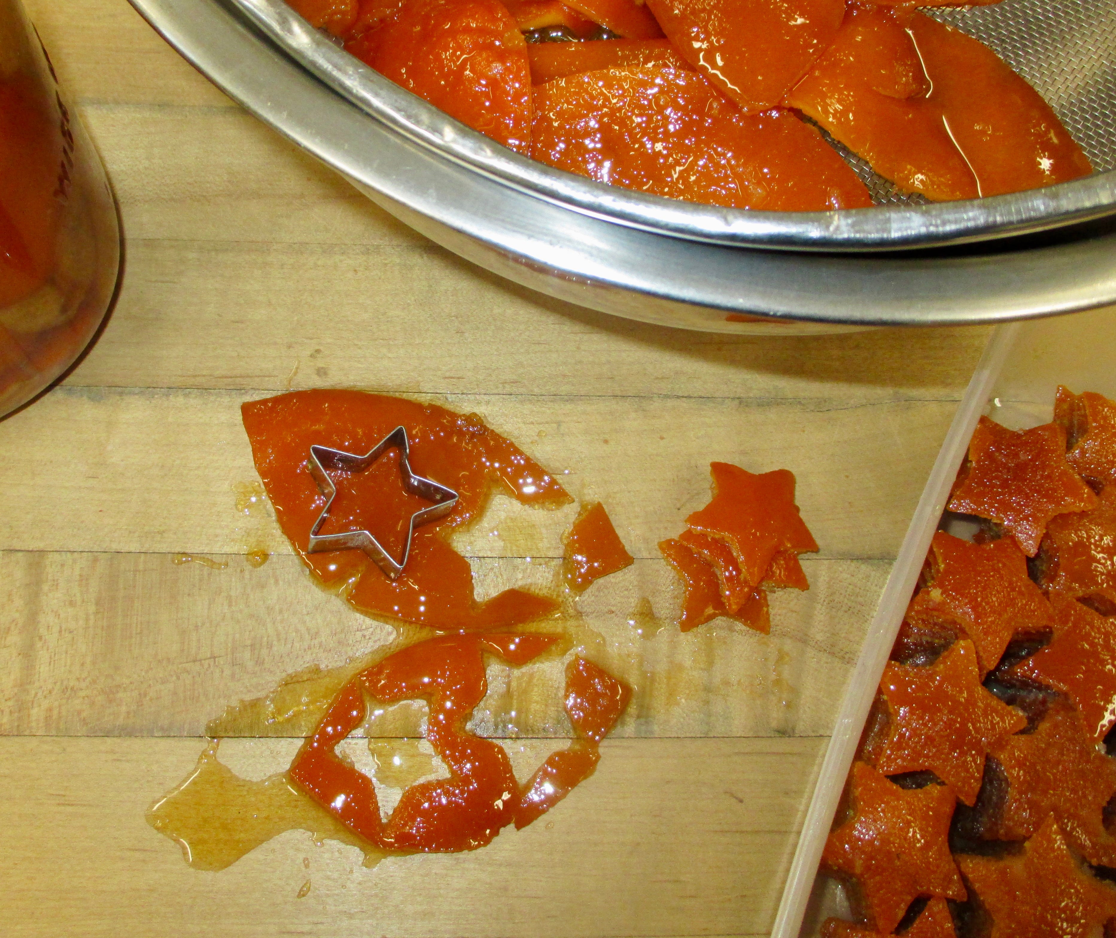 It is time-consuming but not unpleasant to cut the thousands of citrus peel stars and flowers that top the cakes. This is the first step in cake production, as the peel left behind will go into the cakes. I move on to cutting all the peels for the year, then order the nuts and fruits, and prepare all to bake.