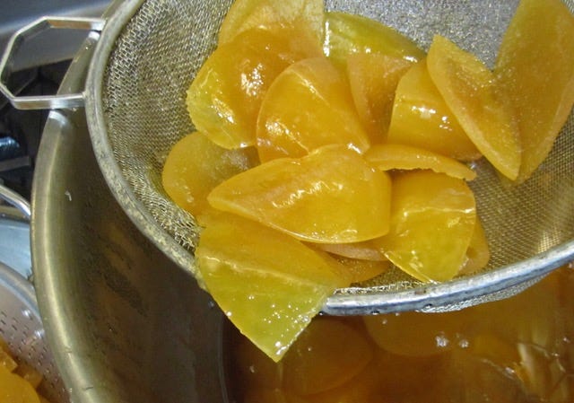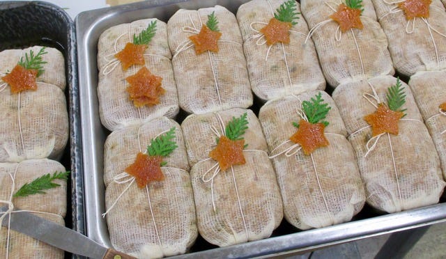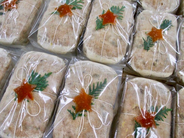 Production of my fruitcakes spans the year, from candying exotic citrus peels in January until I wrap the last ones in December. After over 20 years every nuance has been honed to the bone. I start months ahead, so the final process needs just my eyes and hands, my mind free to wander as I bake, or do final assembly.