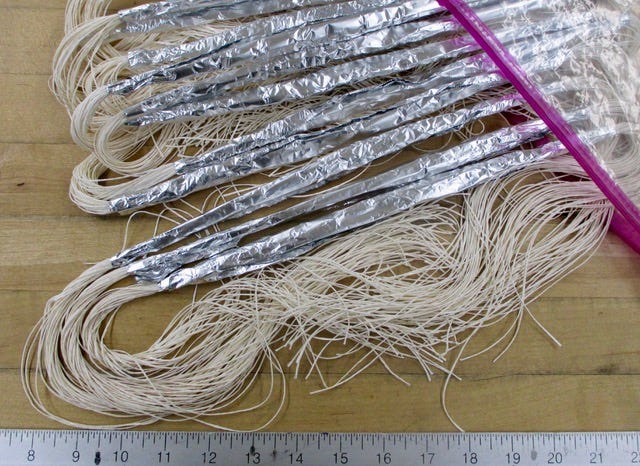 Quivers: A Love Story. These will tie the cheesecloth to the cake. I measure and cut them, then roll them into bundles in tin foil; later I can easily pull out one at a time.