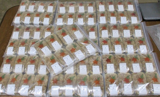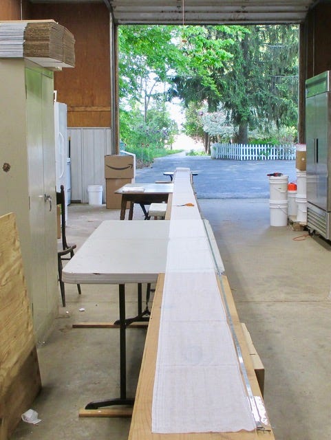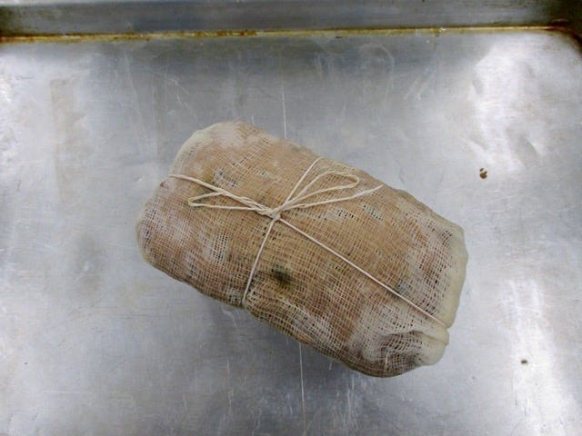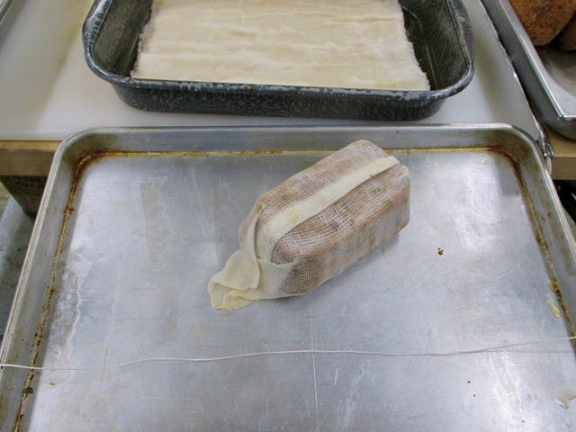 The most punishing task. I need to cut 800 yards of cheesecloth into 1 ft. lengths, and the only way is one at a time. It snags easily, the weave needs to be straightened the length of the run or it will twist and won’t fit the cake. My one pound cake takes exactly 1 foot of cheesecloth, and exactly 1 yard of string.